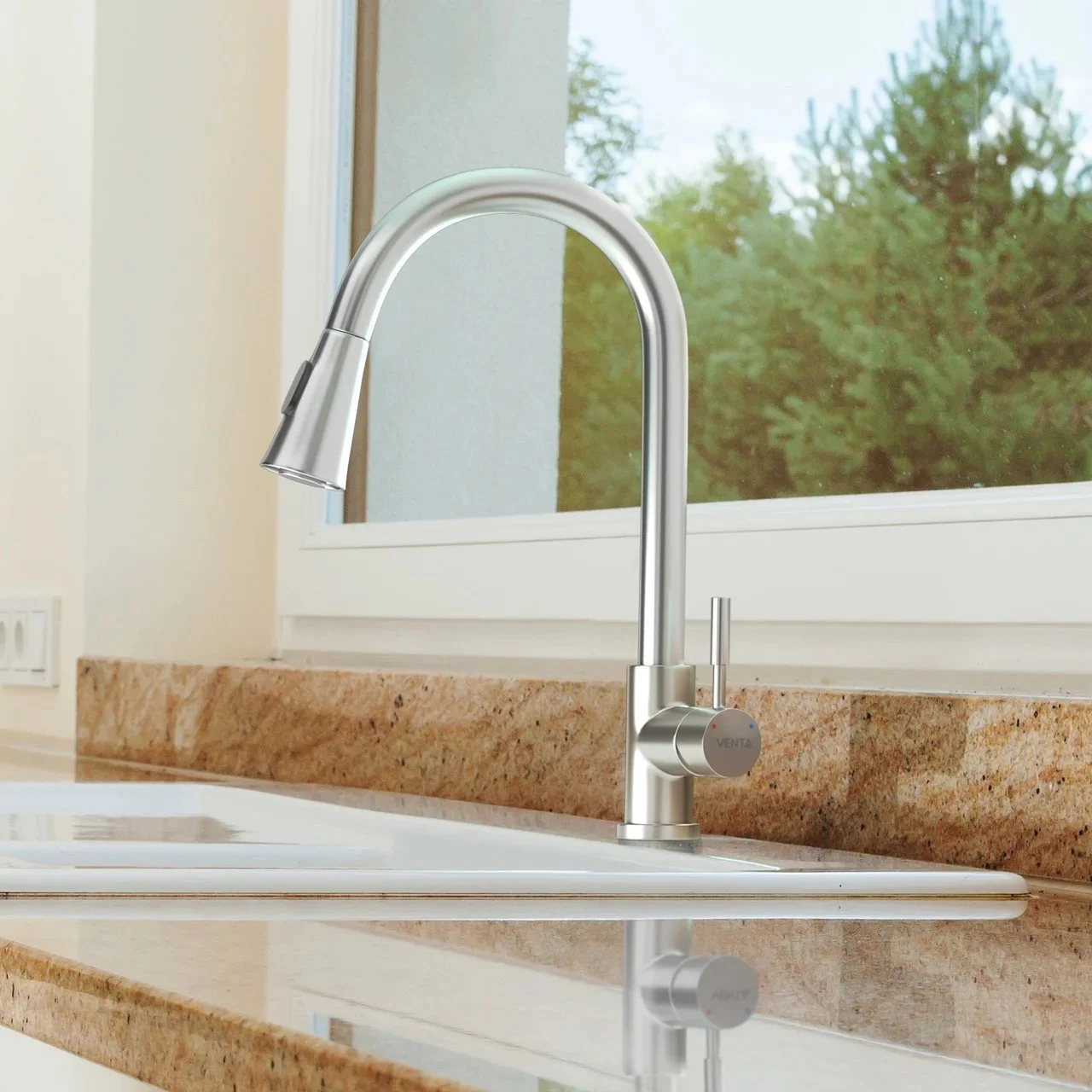 Смеситель для кухни VENTA с изогнутым изливом. Смеситель однорычажный с керамическим картриджем 35 мм. Главным преимуществом смесителей Venta является, то что они сделаны из пищевой нержавеющей стали SUS 304, не содержит вредных примесей.