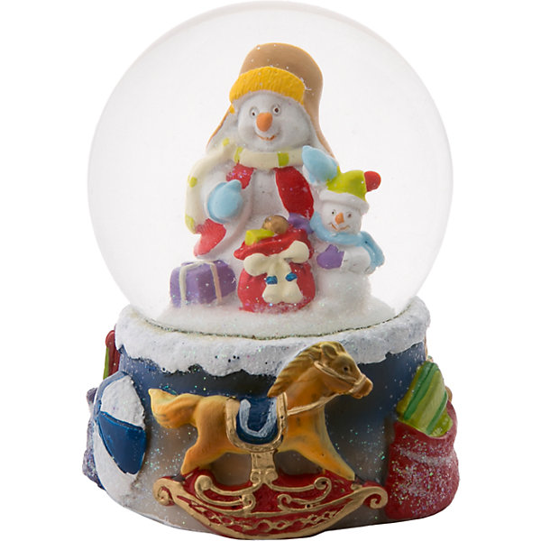 На цветной основе из нескольких детских игрушек, таких как лошадка и мячик. Сверху плотно установлен стеклянный шар, внутри которого два снеговичка и мешок с подарками. При движении внутри шара начинает кружиться искусственный снег. Именно из-за этого эффекта статуэтки с шаром стали популярны во всем мире. Такая статуэтка станет хорошим новогодним подарком для ребенка. Кроме того, впоследствии вы сможете подарить целую коллекцию таких игрушек.