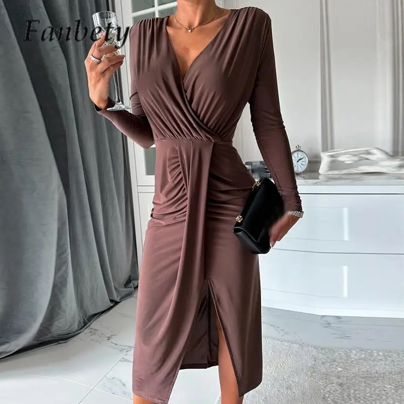 Соблазнительное однотонное Плиссированное женское осенне-зимнее платье с V-образным вырезом и длинным рукавом, облегающее платье с зауженной талией, элегантное женское коктейльное платье