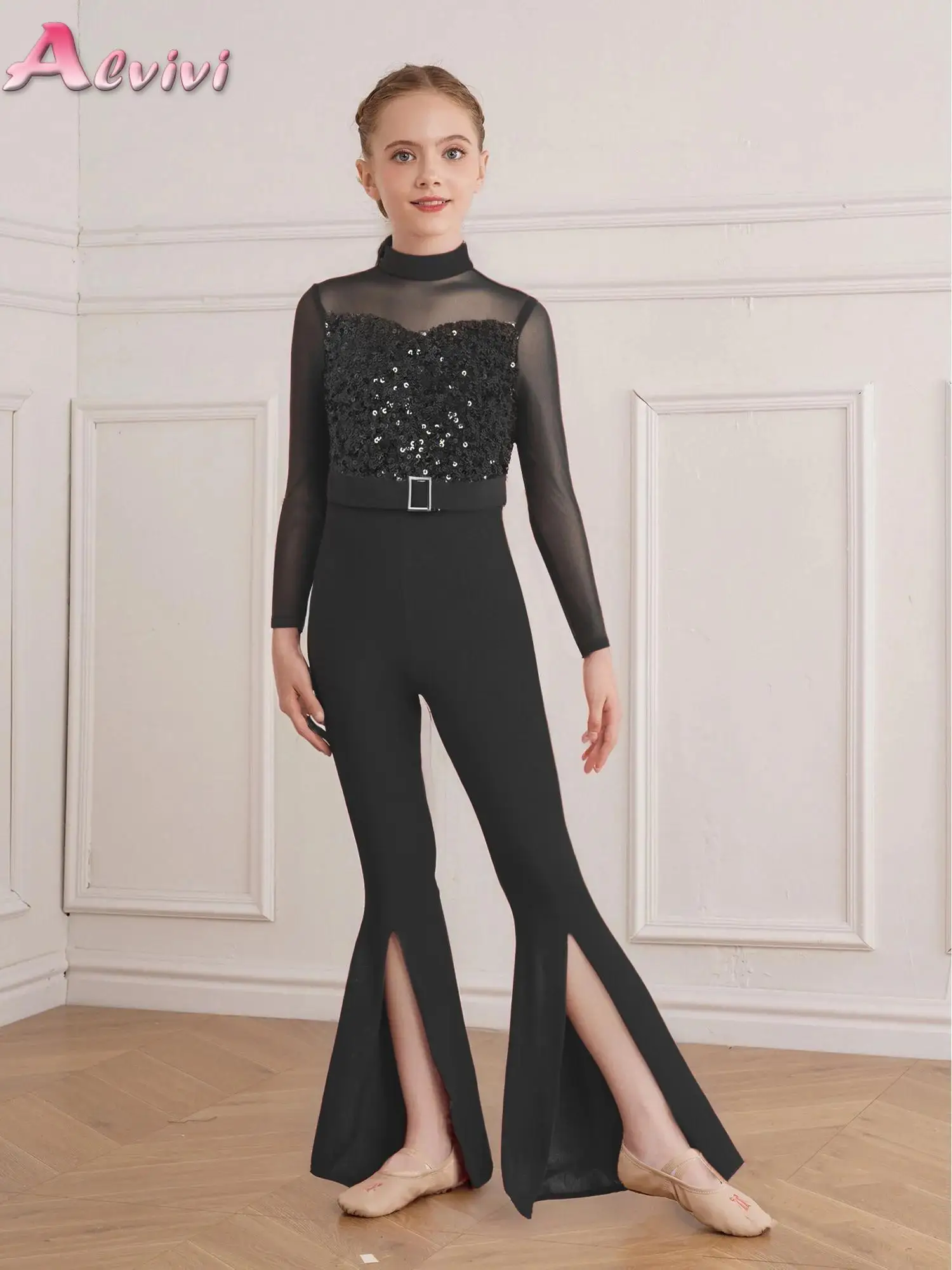 Kids Girls Split Bell-Bottom Jumpsuit Mock Neck Sheer Mesh Sequins Hip Hop Jazz Dance Performance Costume 70s Disco Bodysuits