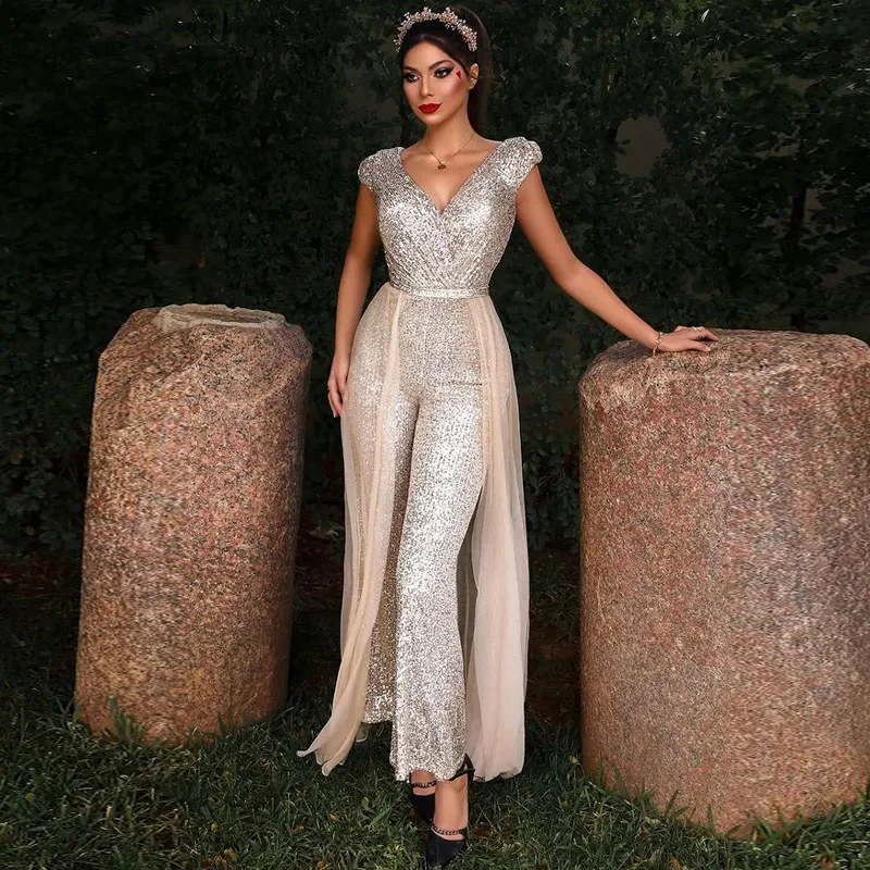 Современный женский комбинезон со съемным шлейфом и V-образным вырезом