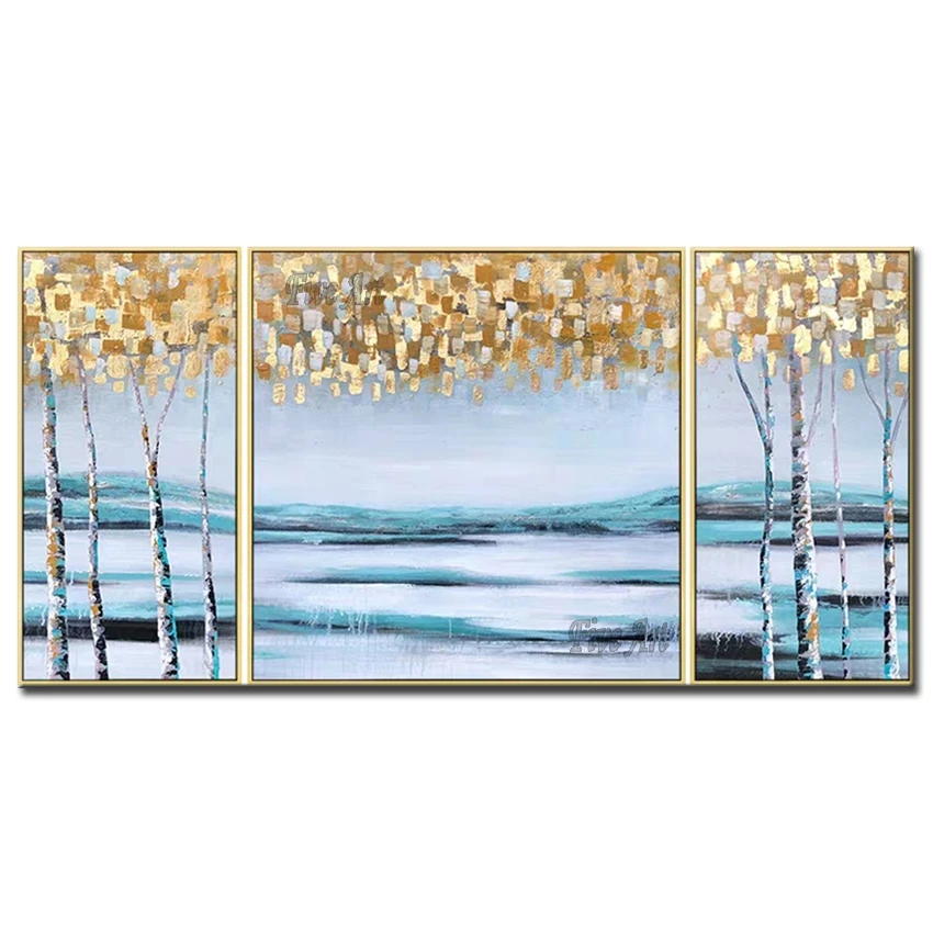 Современный новый золотой фольга текстурированный реферат Дерево картина маслом холст картина на стену ручная работа 3 шт. холст настенная ...