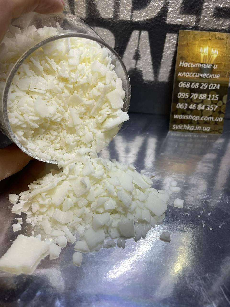Воск соевый - натуральный продукт, представленный в виде хлопьев (непрозрачная гранулоподобная структура) бело-бежевого оттенка и плавится при температуре 42-52°С. Сырьем служит масло соевое, производимое из соевых бобов (его гидрогенизированная форма). Имеет приятный натуральный аромат схожий с белым шоколадом. (На фото также показаны свечи созданные из данного воска)