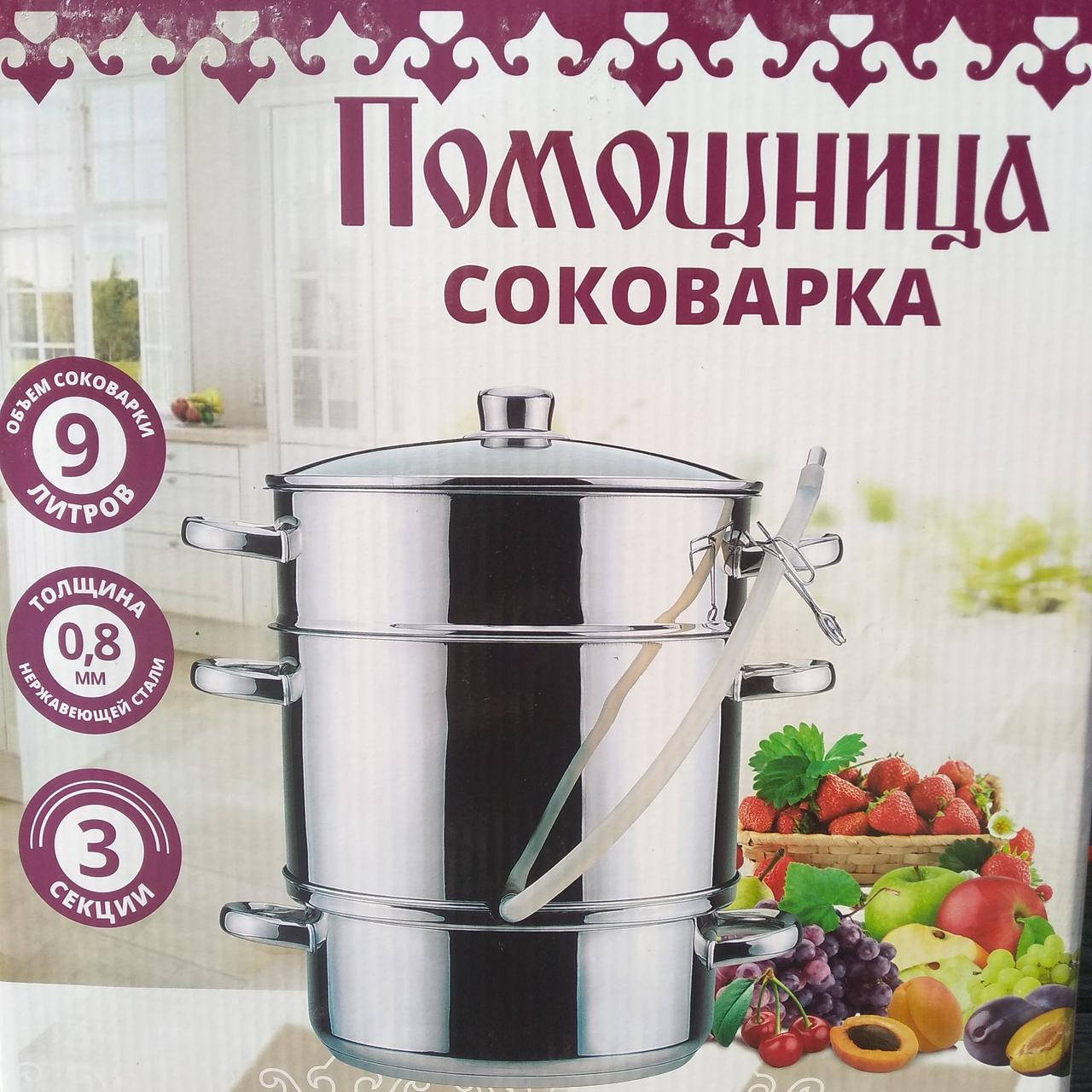 Соковарка из нержавейки Помощница на 9 литров. В комплекте три емкости и стеклянная крышка. Толщина металла 0,8 мм. Многослойное капсульное дно, подходит для всех видов плит.
