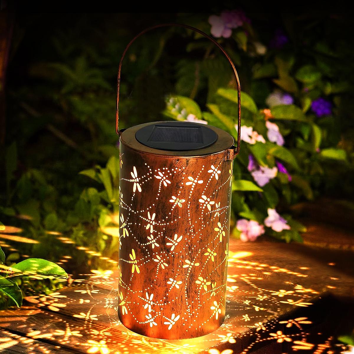 Солнечная железная полая лампа с металлическим цилиндрическим каркасом, фонарь-стрекоза, уличный водонепроницаемый садовый декор, подвесной светильник темно-коричневого