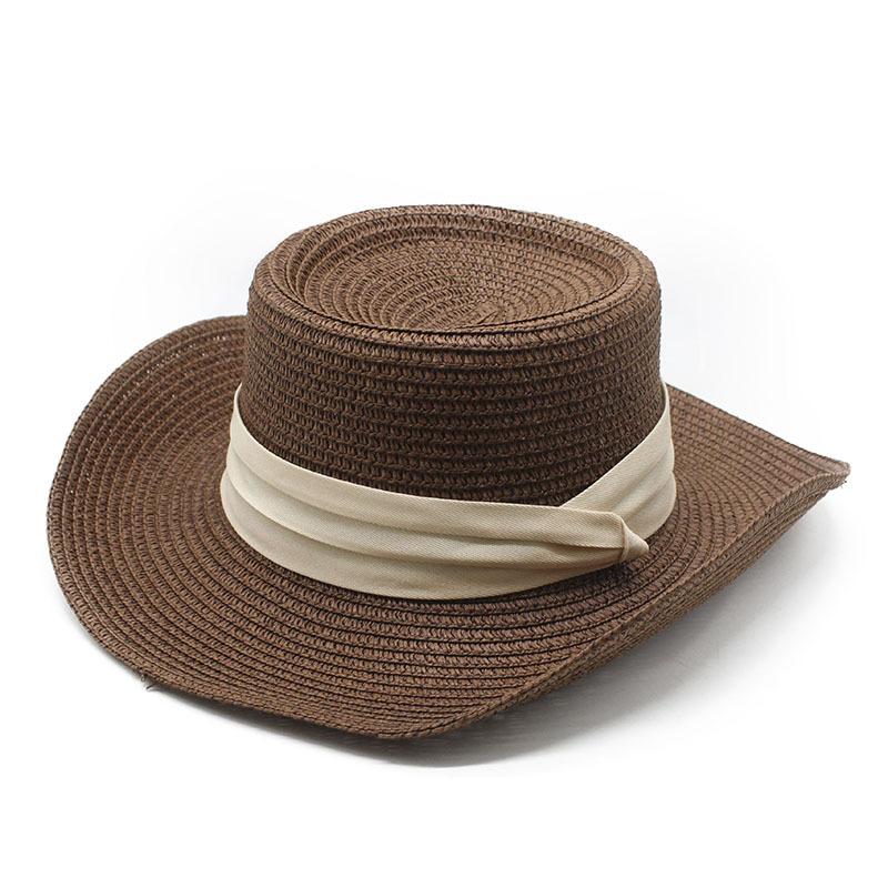 Солнцезащитная летняя французская соломенная шляпа с плоским верхом, черный пояс, женская тройная складка с прибрежным пляжным верхом, солнцезащитная тканая шляпа M(56-58cm) темно-коричневого