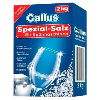 Соль необходима для смягчения воды высокой жесткости, для защиты от появления накипи и известкового налета на внутренних элементах машины. Кроме того, средство препятствует появлению разводов на посуде. Препарат содержит полностью растворимую благородную соль в гранулах соответствующего размера. Регулярное использование защитной соли Gallus обеспечивает правильную работу посудомоечной машины и долговременную защиту ее механизмов.