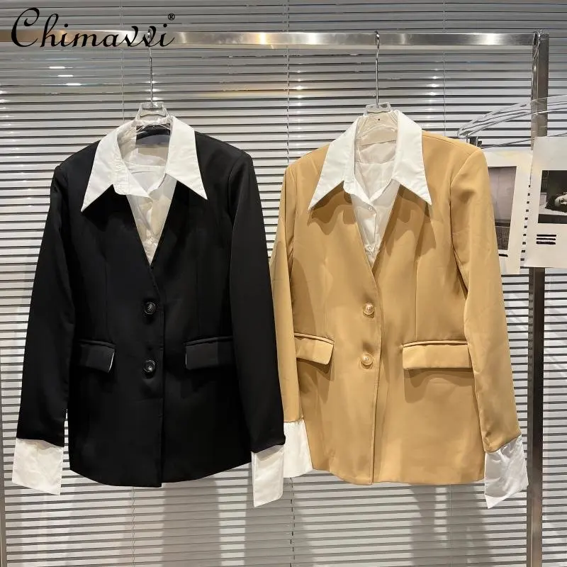 2022 Autumn New Fashion Shirt Leader Stitching Fake Two Pieces Padded Shoulder Suit Coat Loose Long Sleeve Office Lady Jacket