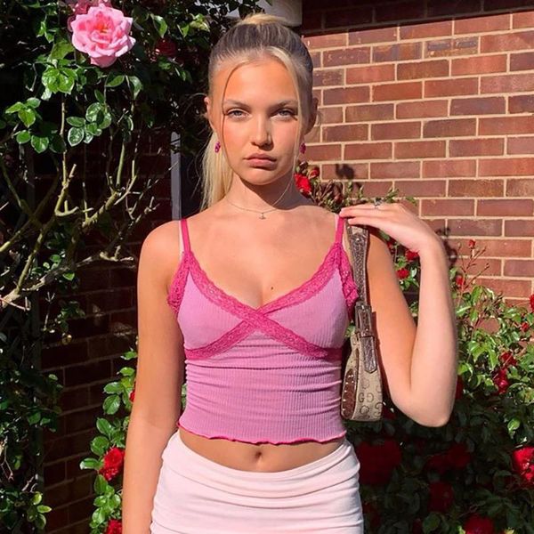 women's tanks & camis patchwork lace tank summer crop women pink casual cropped purple spaghetti straps ropa mujer, White