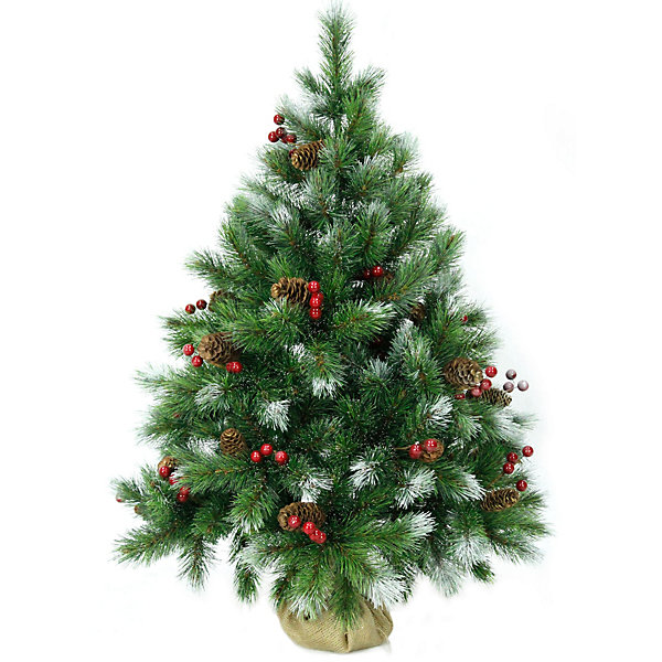 Сосна с пушистыми ветками. Имеет классический силуэт. Посеребрённые кончики иголок слегка искрятся. Декорирована ягодами и натуральными шишками.