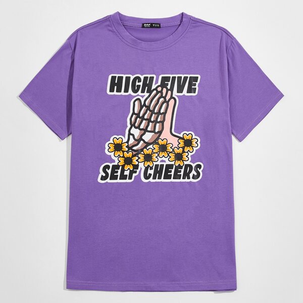 Пурпурный Институтский Короткий рукав Хлопок Со цветочками буква Неэластичный Лето Мужские футболки и майки, size features are:Bust: ,Length: Обычные ,Sleeve Length:Короткий рукав