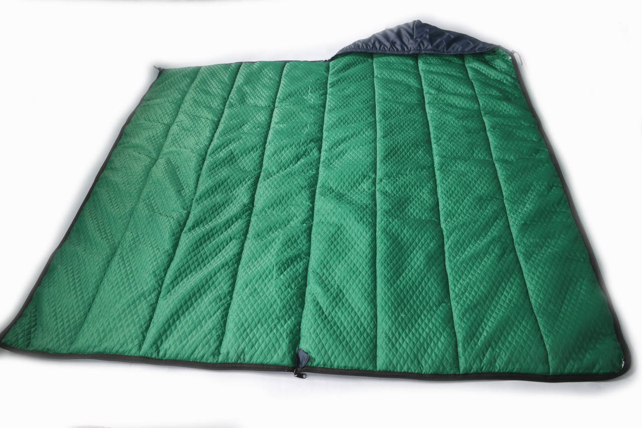 Спальный мешок размером 95 х 235 сантиметров. Имеет полностью откидное одеяло на молнии, затягивающийся шнуром капюшон, чехол для переноски. Изготовлен из ткани с водоотталкивающей поверхностью. Змейка слева - снизу. Особенность данной модели – можно использовать как одеяло или покрывало.