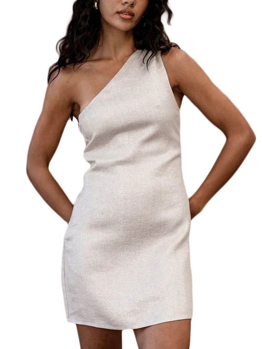 Элегантное однотонное мини-платье на одно плечо для женщин-Повседневное облегающее короткое платье без рукавов с рюшами в шикарном стиле и