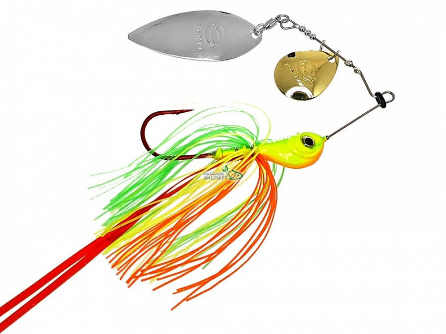 Верхние лепестки имеют серебристое и золотистое покрытие, голова и опушка спиннербейта Косадака окрашены в разные оттенки.