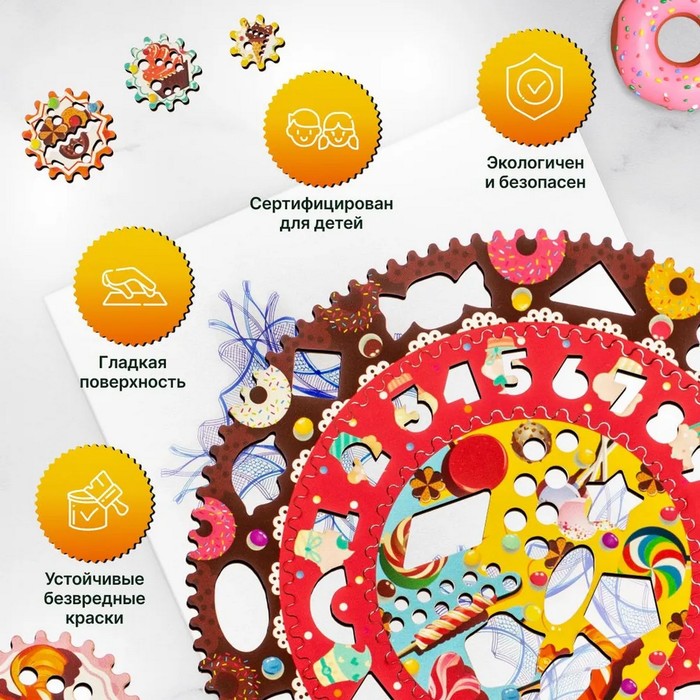 Спирограф — многофункциональная деревянная развивающая игрушка для рисования. Он имеет яркое оформление с тематическими изображениями, состоит из 2 зубчатых колёс с фигурными трафаретами и 5 кругов-шестерёнок.Как рисовать спирографом?На листе бумаги расположите зубчатое колесо спирографа, в него поместите один круг.В одном из отверстий круга зафиксируйте кончик пишущего предмета (ручки, карандаша, фломастера и т. д.) и начните совершать вращательные движения рукой.На бумаге появится спиралевидный узор. Используя различные пишущие принадлежности и отверстия кругов, можно получить бесконечное множество рисунков.Занятия со спирографом развивают внимание, память, мышление, тренируют координацию движений и моторику рук. Такая игрушка благотворно влияет на формирование творческих способностей малыша. Она наверняка станет любимым инструментом юного художника.
