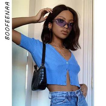 BOOFEENAA Solid Button Up Short Sleeve Crop Top T Shirt 2020 Summer Clothes for Women Ribbed Knit Casual Streetwear Tops C70-H54