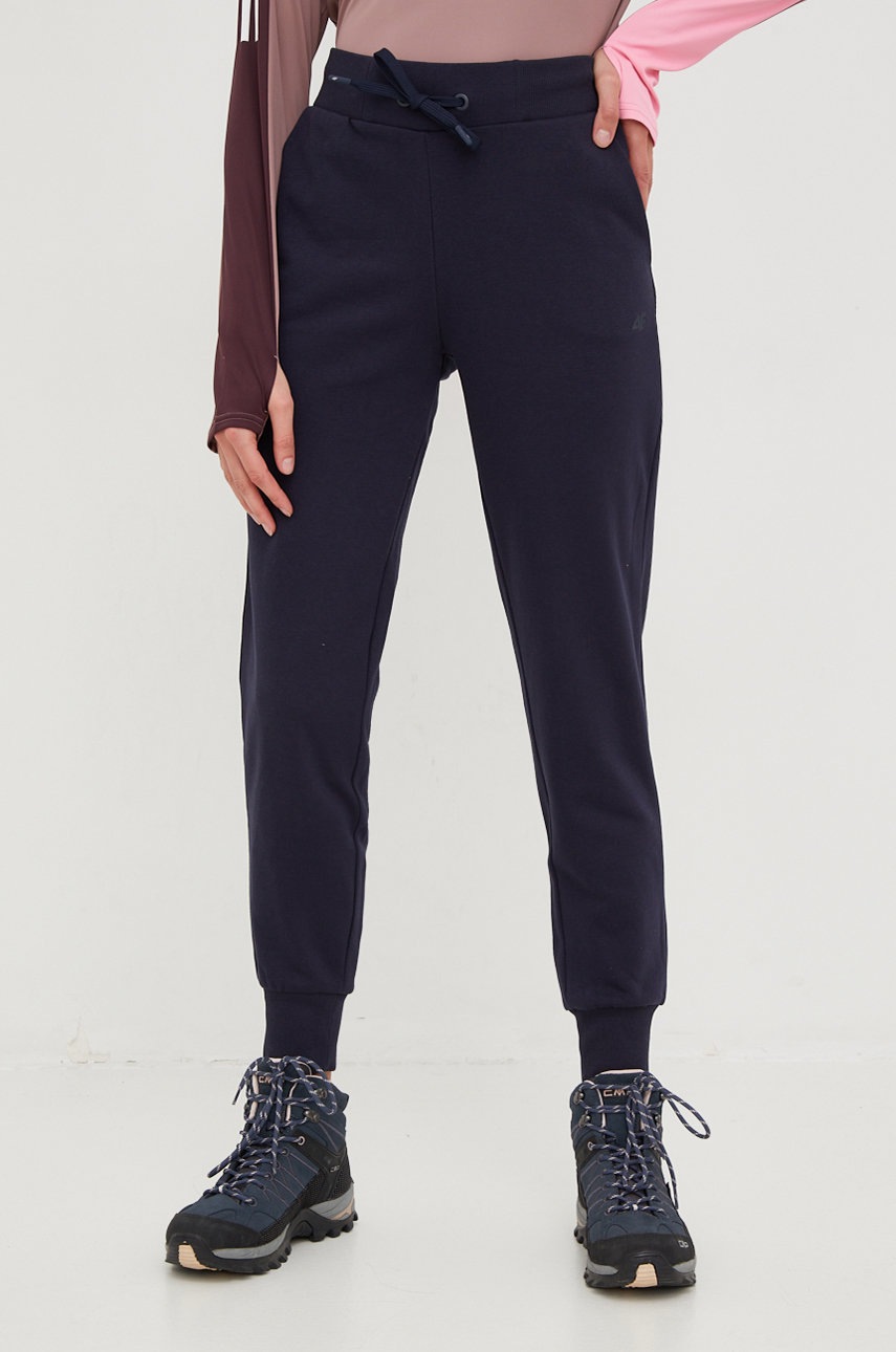 Спортен панталон от колекция 4F. Моделът е направен от еластична материя.- Стандартна кройка.- Еластични краища.- Два странични джоба.- Висока талия.- Регулируема талия с връзки.- Еластична талия.- Ширина в талията: 36 cm.- Ширина в бедрата: 49 cm.- Височина на талията: 30 cm.- Ширина на крачолите в долната част: 11 cm.- Ширина на крачолите: 29 cm.- Дължина на крачолите: 103 cm.- Мерките се отнасят за размер: S.