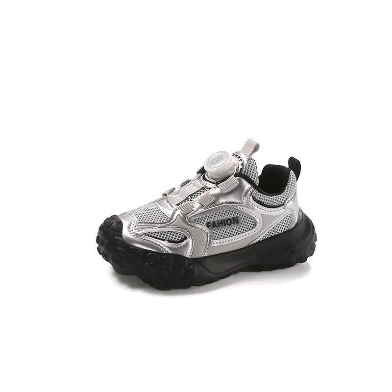 Спортивная обувь для мальчиков и девочек с вращающимися кнопками, детские кроссовки для бега, повседневная сетчатая дышащая обувь 2024 года, новые модные детские кроссовки 26 серебряный