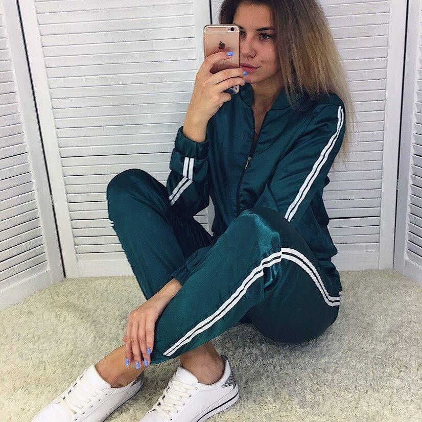 Женский стильный костюм двойка ( штаны, кофта). Ткань стрейч атлас, края обработаны белой бейкой, пояс штанов на резинке со шнурком, кофта на змейке. Размер 42-44.