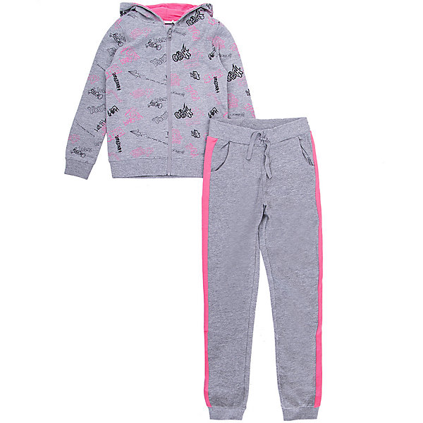 Очень удобный и комфортный спортивный костюм состоит из толстовки и брюк. Не сковывает движений и не вызывает чувства дискомфорта, позволяя коже дышать. Идеально подойдёт для занятий спортом или прогулок. У толстовки свободный капюшон с контрастной подкладкой, декорирована принтом. Брюки с цветными полосками по бокам, а талию можно регулировать завязками.