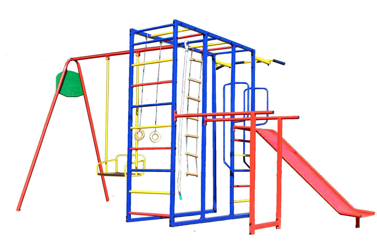 Материалы: металлические стойки и металлические перекладины, металлическая горка, турник с прорезиненными ручками, качели металлические, сидение качелей - водостойкая фанера.