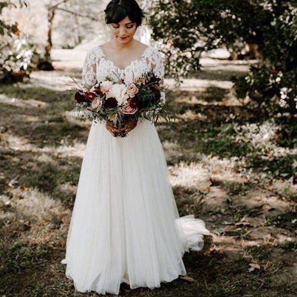 2019 new white boho beach wedding dresses long sleeve lace bridal party gown robes de mariee sheer neck wedding gowns