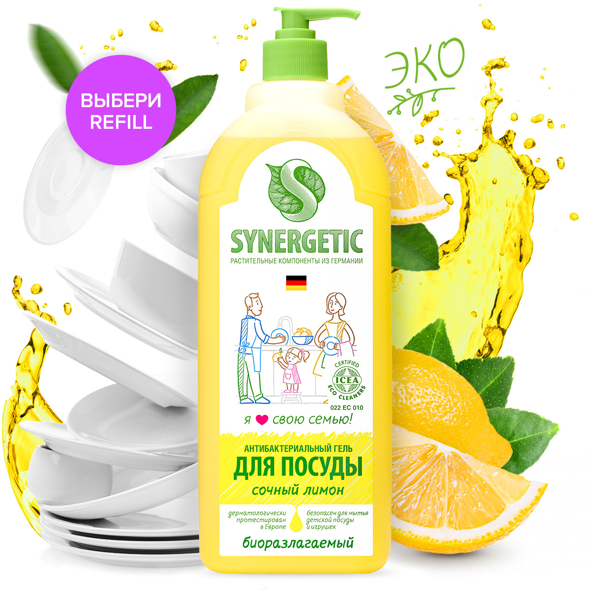 Средство для мытья посуды SYNERGETIC, 1л, жидкость, Сочный лимон (00000364)