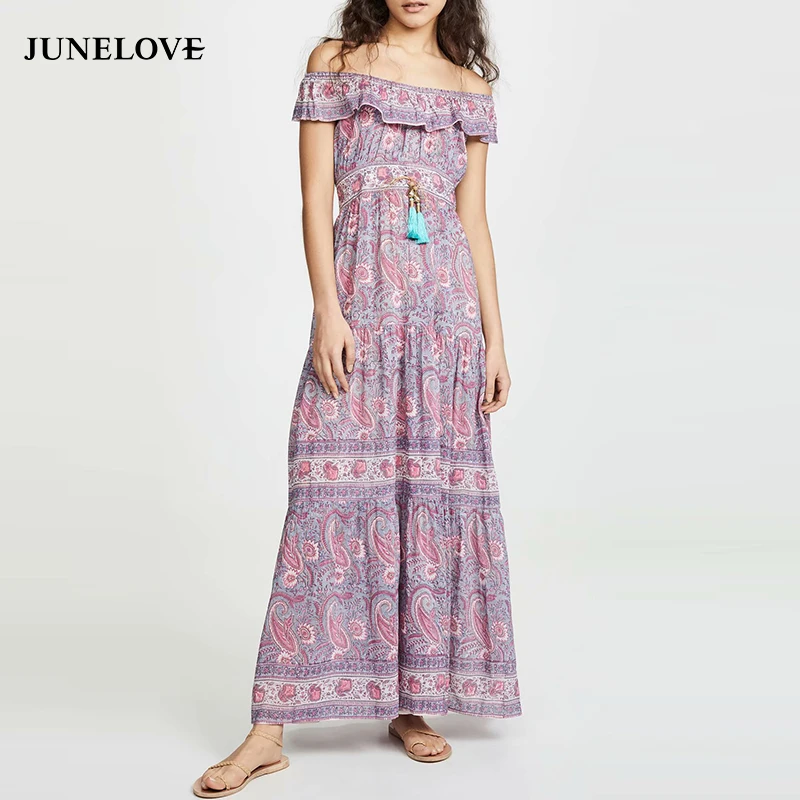 JuneLove Women Summer Sexy Ruffles Boho Dress Vintage Print Floral Female Off Shoulder Long Maxi Dress Casual Holiday Lady Dress
