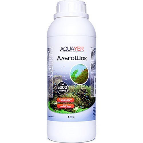 AQUAYER АльгоШок - средство против зеленых нитчатых водорослей и цветения воды, разработанное Сергеем Ермолаевым. AQUAYER АльгоШок действует на те водоросли в аквариуме, против которых AQUAYER Альгицид+СО2 слабо эффективен. Эти два альгицида имеют разный механизм действия на водоросли. Если Альгицид+СО2 более эффективен против красных водорослей (черная борода, олений рог) и ксенококуса, то действие АльгоШока больше сфокусировано на зеленых нитчатых водорослей и цветение воды (зеленая вода).