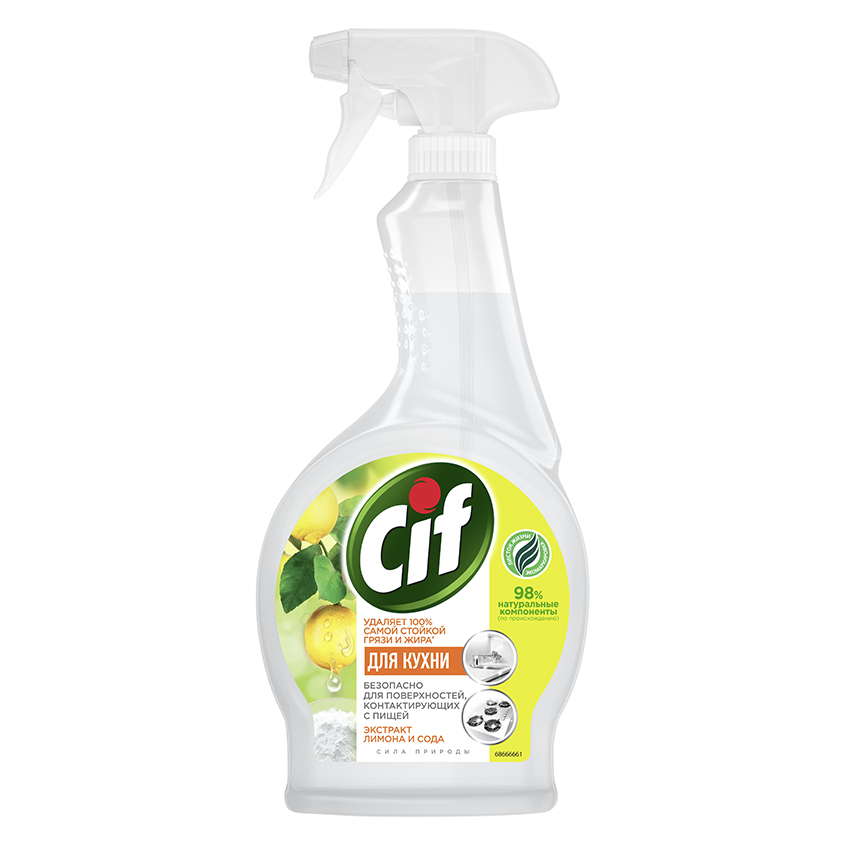Чистящий спрей Антижир для кухни Cif Сила природы, 500 мл — может стать незаменимым другом для идеальной эко-уборки! Продукт имеет уникальную биоразлагаемую формулу, которая глубоко проникает в самое сердце загрязнений. Жироудалитель Cif Сила природы для кухни эффективно растворяет жир, застарелые, пригоревшие пятна от пищи, налет на вытяжке и в духовом шкафу. Спрей Cif для кухни сохранит поверхности блестящими и сияющими надолго. В составе продукта уникальная в линейке чистящих спреев Cif формула без хлора: натуральная cода и экстракт лимона помогут эффективно удалить загрязнения на кухне! Чистящее средство без фосфатов существует! Cif Сила Природы также не содержит парабенов. Чистящее средство оптимально для поверхностей из керамики, стекла, нержавеющей стали. Не бойтесь протирать столешницы из натурального и искусственного камня, кафельную плитку, краны с хромированным покрытием. Спрей Cif Сила природы не содержит абразивные частицы и деликатно очищает изделия, не оставляя царапин и повреждений. Средство для кухни Cif Сила природы имеет легкую, полужидкую текстуру, легко наносится и смывается. Продукта объемом 500 мл хватит на несколько месяцев интенсивного использования согласно рекомендациям на инструкции. Чистящий спрей оставляет освежающий, цитрусовый аромат в качестве финального штриха для идеального результата уборки средством с 99% натуральных компонентов!