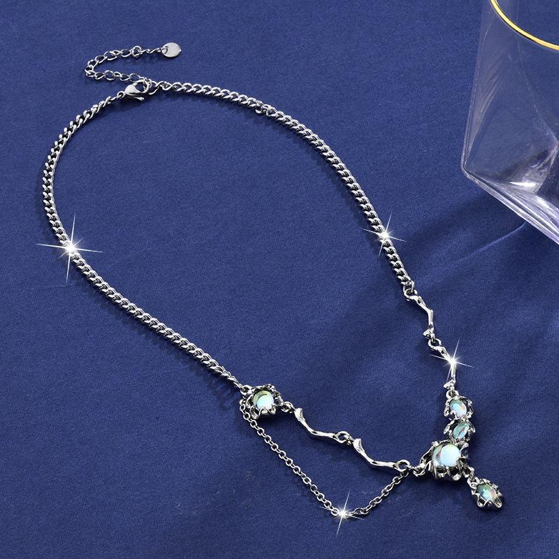 Стальное Элегантное Титановое Колье-Цепочка с Замком с Лунным Камнем и Стильным Мотивом Ветка