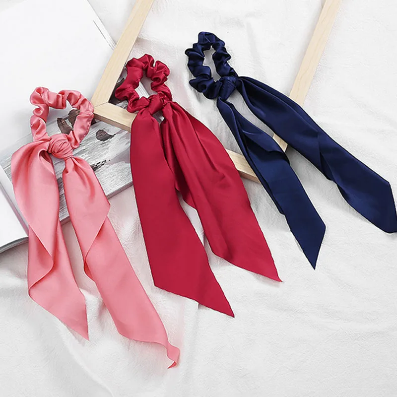 Fashion women For Scarf Bow Tie Hair Band Ribbon Headwear Tassel Ponytail Hair Tie Satin Solid Color Printing Long Stre