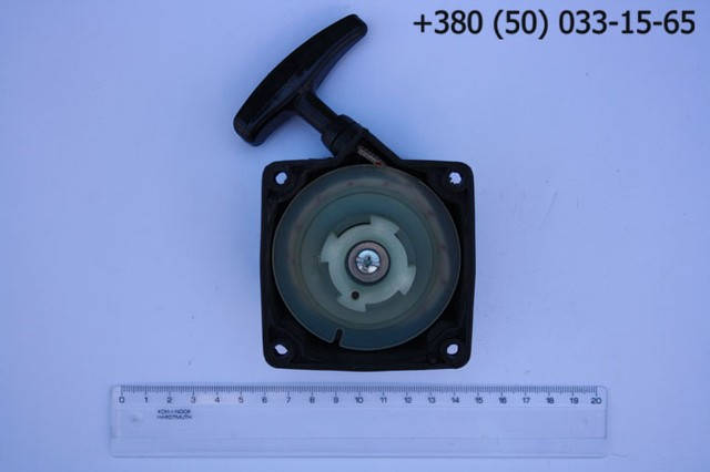 Стартер для мотокосы СМ-4. Расстояние между центрами посадочных отверстий 65 мм. на 65 мм. Подходит для большинства российских и китайских мотокос.