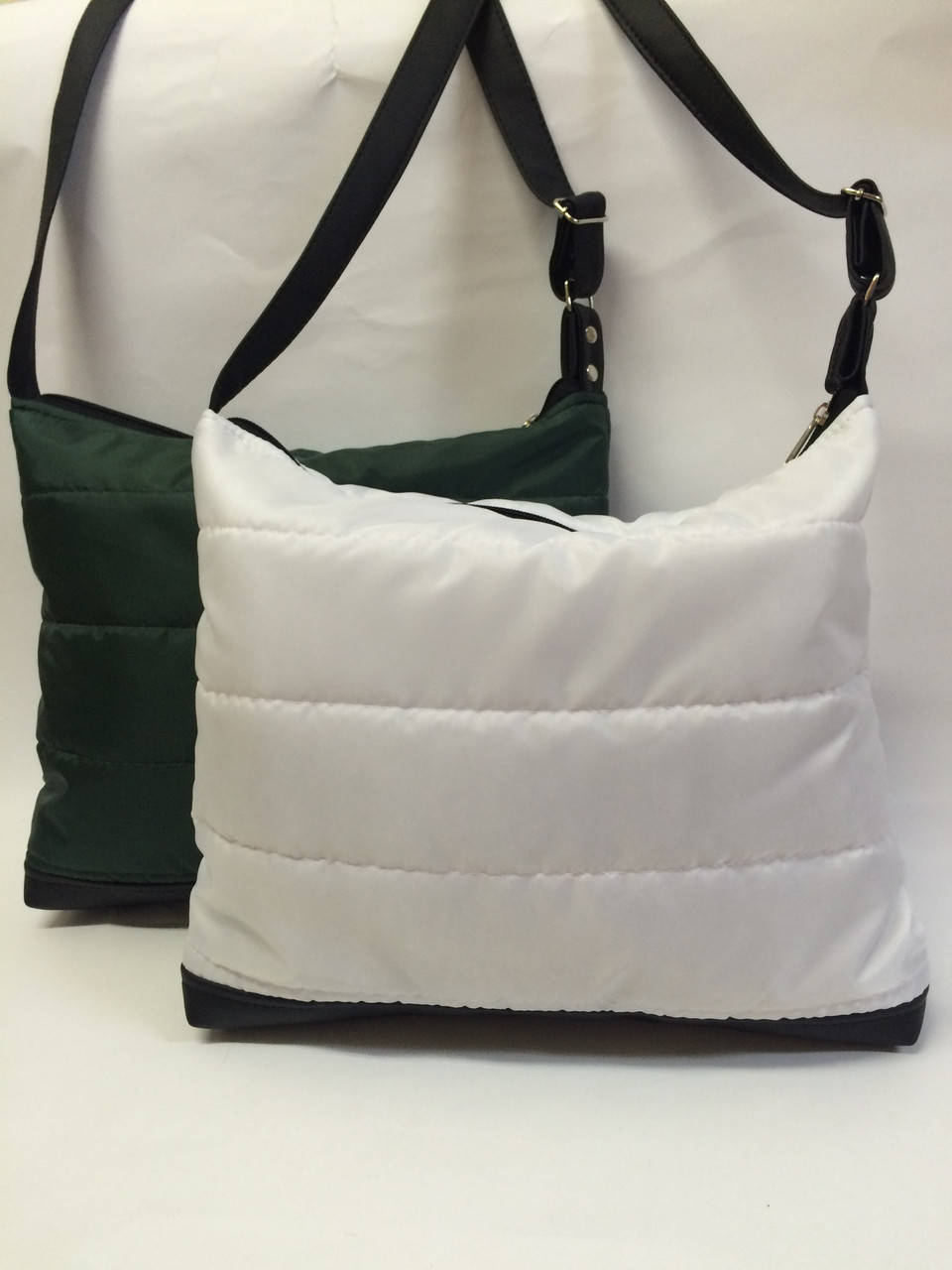 Вместительная женская стеганная ( дутая ) сумка. Размер 37х31 см дно 5см. Сочетание стеганной плащевки и плащевки. Длинная регулирующееся ручка ( макс длина 145 см. Одно отделение, внутренний карман. Застежка- молния, подкладка. Страна производитель- Украина.