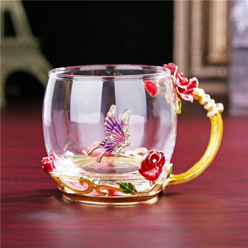 Стеклянная эмалированная чашка для воды с тиснением цветка розы, милый подарок, стеклянная чашка для воды Red Cup A(301-350ml)