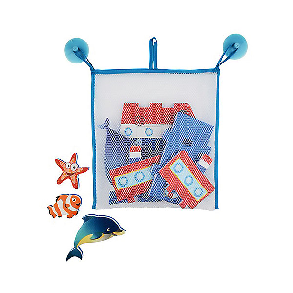 В набор входят 10 деталей-стикеров, с помощью которых малыш сможет создавать в ванне картины с красивым объемным пароходом и морскими обитателями (дельфином, китом, рыбкой и морской звездой). А когда игра окончится, нужно высушить стикеры и убрать их в удобную сетчатую сумочку до следующего купания.
