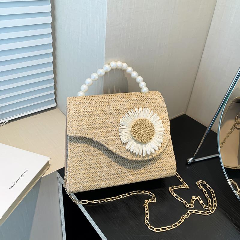 Стильная простая плетеная сумка через плечо, простая сумка, новинка лета 2024 года, маленькая квадратная сумка через плечо с цветочным принтом и жемчугом белый
