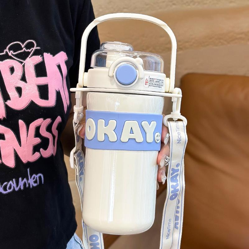 Стильная термокружка для девочек из нержавеющей стали 316 с трубочкой и ремешком через плечо, двойное отверстие, модель 2023 г. 635ml