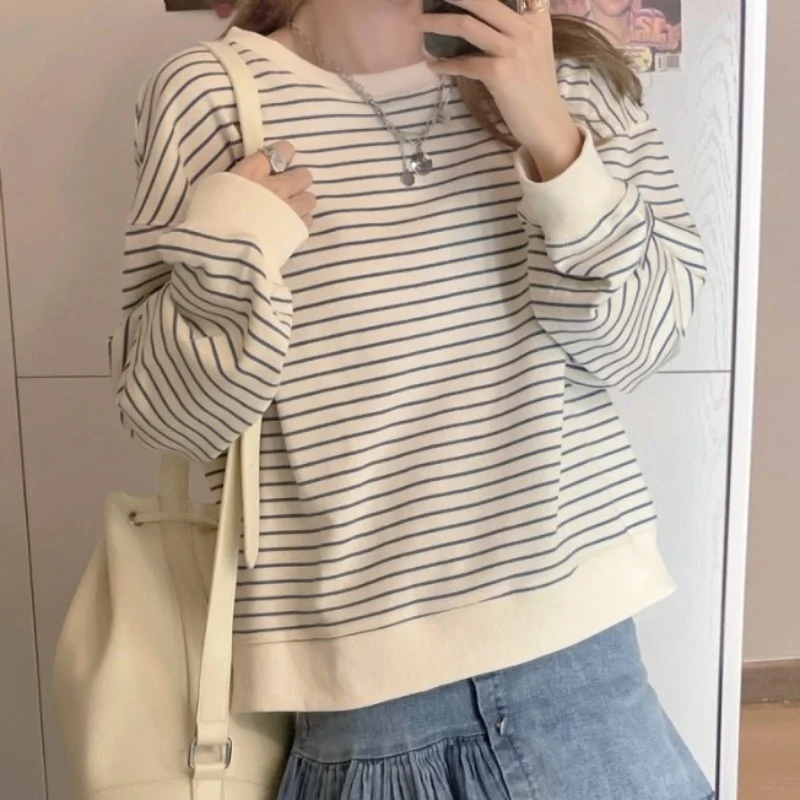 Стильная футболка в полоску с длинным рукавом, Осенний Свитер оверсайз, новинка 2021 года, свободный и ленивый стиль, Топ для женщин.