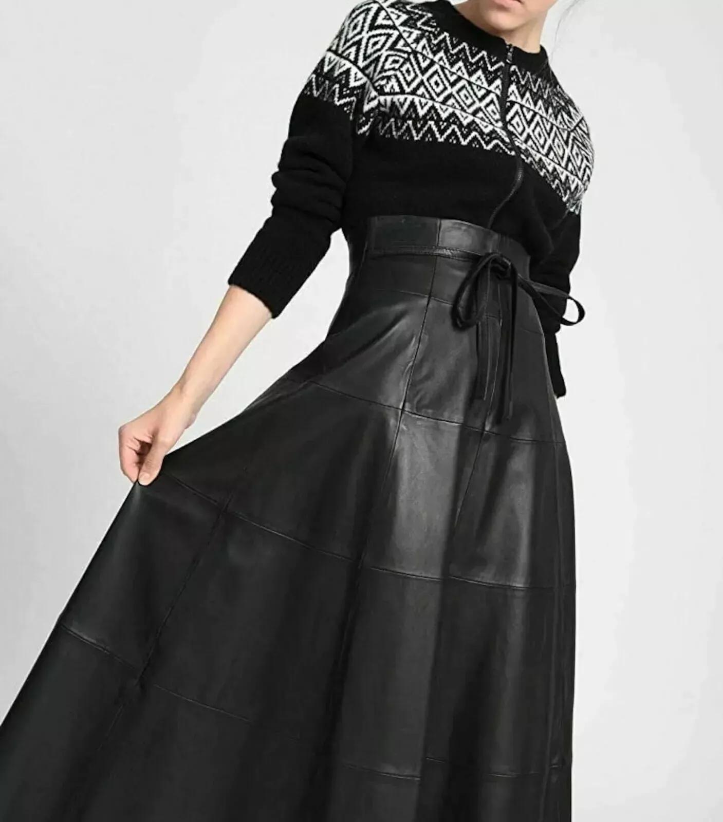 Стильная черная кожаная юбка женская длинная из натуральной овчины ручной работы элегантная одежда M