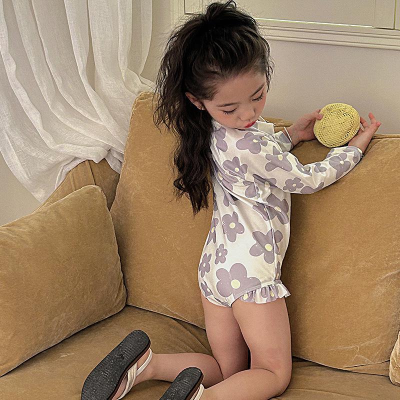 Стильный цветочный купальник для девочек с длинными рукавами и защитой от солнца для пляжного или весеннего отдыха 90 фиолетовый