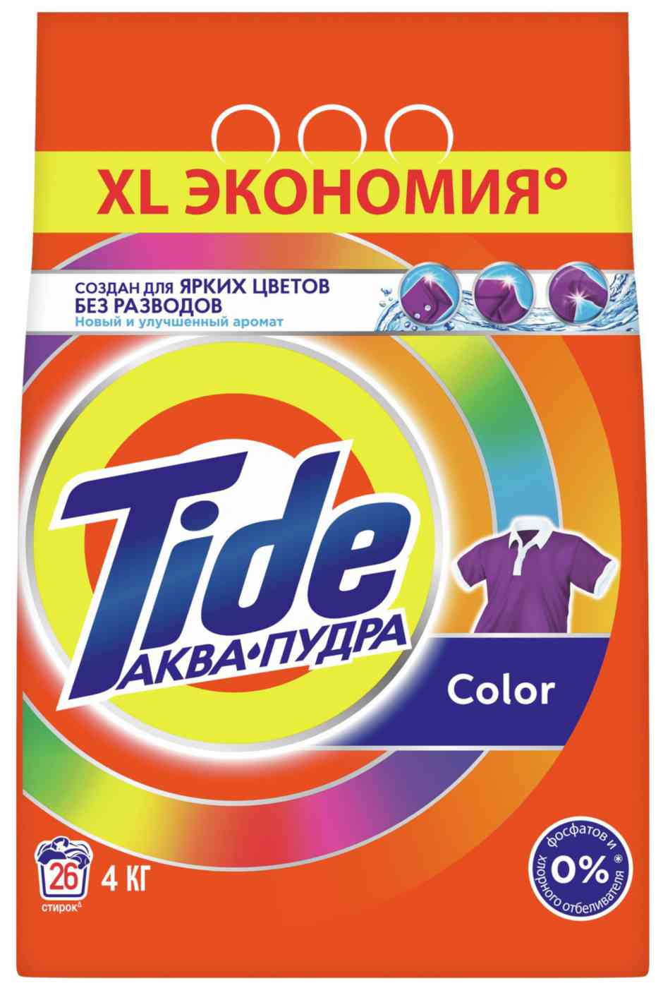 Порошок для стирки Tide Аквапудра Color для цветных тканей позволяет поддерживать одежду всей семьи в идеальной чистоте и отличном состоянии. Стиральный порошок Tide Аквапудра Color прекрасно справляется даже с самыми трудно выводимыми пятнами на одежде, сохраняя яркие цвета стирка за стиркой. Благодаря технологии Аквапудра, порошок растворяется, только коснувшись воды, и моментально активируется, глубоко проникая в структуру ткани, чтобы обеспечить кристальную чистоту вашей одежды без разводов и остатков порошка даже на темных вещах и на швах. Если у вас чувствительная кожа, рекомендуем обратить внимание на стиральный порошок Тайд для чувствительной кожи.ПРЕИМУЩЕСТВА TIDЕ АКВАПУДРА:- Удаляет трудновыводимые пятна даже на манжетах, воротничках и в области подмышек- Дарит безупречную чистоту, сохраняя яркость цвета стирка за стиркой- Кристальная чистота с первой стирки даже при 20°C- Безопасный состав: 0% фосфатов и хлорсодержащего отбеливателя- Средство быстро растворяется, не оставляя разводов следов на одежде- Представлен в виде жидких средств: капсул «Все-в-1» и геля для стиркиTide тщательно подбирает ингредиенты для своих средств. Наши стиральные средства не содержат фосфаты и хлорные отбеливатели.Для дополнительной мягкости рекомендуем использовать кондиционер для белья Lenor: он защищает одежду от появления катышков, потери формы и потери цвета. Теперь ваши любимые вещи прослужат вам еще дольше.