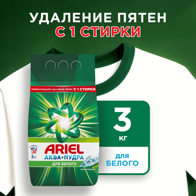 Безупречная белизна и приятная свежесть одежды дарят прекрасное настроение и уверенность в себе, поэтому очень важно уделять должное внимание стирке. Именно для этого создан стиральный порошок Ariel Аквапудра Горный родник для белых вещей. Ariel Аквапудра растворяется, едва коснувшись воды, и моментально активируется: удаляет трудновыводимые пятна, глубоко проникая в структуру волокон, и не дает загрязнениям въедаться. Порошок устраняет загрязнения, вызывающие неприятные запахи, такие как запах пота и тела, придавая одежде приятный аромат и сияющую белизну даже на воротничках и манжетах рубашек.Преимущества Ariel АквапудраБезупречное удаление пятен с первой стирки даже при 30°CПорошок быстро растворяется, не оставляя следов на одеждеСохраняет безупречную белизну вещейПомогает справиться с застарелыми пятнамиНе дает грязи и пятнам въедаться в структуру волоконБезопасность превыше всего! В составе порошка нет фосфатов или хлора. Для отбеливания используются кислородосодержащие отбеливатели и безопасные дозировки. Все активные компоненты полностью биоразлагаемы.Для большего эффекта используйте кондиционер для белья Lenor: он защищает одежду от появления катышков, потери формы и потери цвета. Теперь ваши любимые вещи прослужат вам еще дольше.