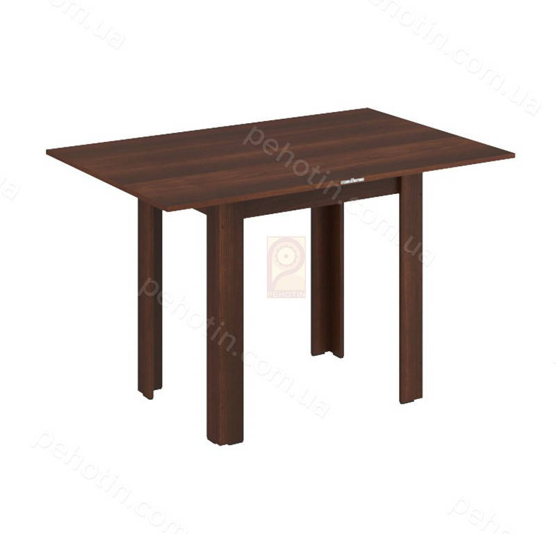 Стол выполнен из ламинированного ДСП, толщиной 16 мм. Прямоугольный раскладной обеденный стол на четырех прямых широких ножках. Раскладывается по типу книжки. Простой и долговечный стол, который не загромождает пространства и разместит большое количество людей. Если кухня просторная и обладает полноценной обеденной зоной, то стол можно поставить в центре. Большое количество расцветок ДСП позволить вписать этот элемент мебели в любой интерьер.