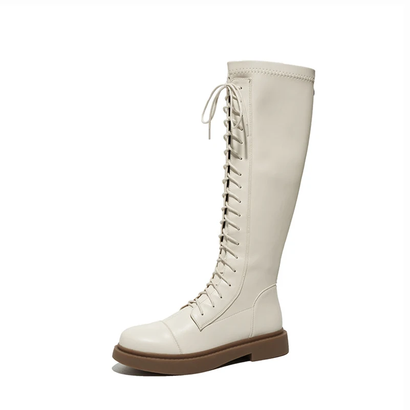 ANNYMOLI Flat Platform Knee High Boots Woman Motorcycle Boots Lace Up Long Boots Zip Round Toe Female Shoes Beige Black Size 40