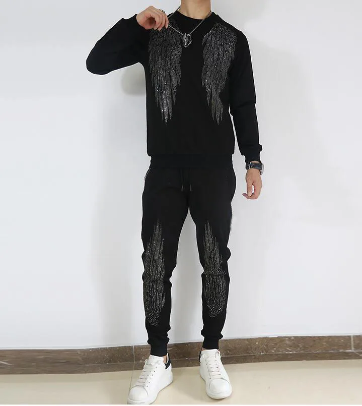 Стразы, модный спортивный костюм с длинным рукавом, красивый костюм из двух предметов, облегающий повседневный мужской костюм