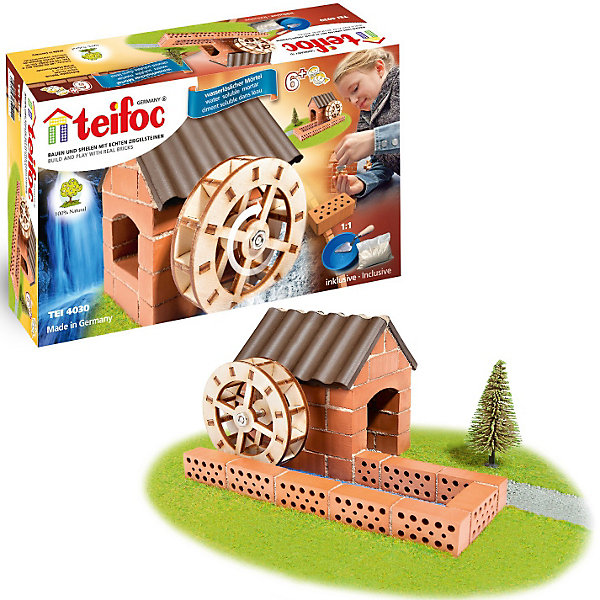 Строительный набор Teifoc «Водяная мельница» включает в себя все необходимое для постройки мельницы. Кирпичики выглядят как настоящие строительные кирпичи. Соединяются они при помощи раствора. Раствор является безопасным для детей, так как создан на основе крахмала. Постройку можно собирать несколько раз. Нужно лишь поместить ее в воду, и как только раствор растворится и кирпичики высохнут, можно начинать строить заново.
