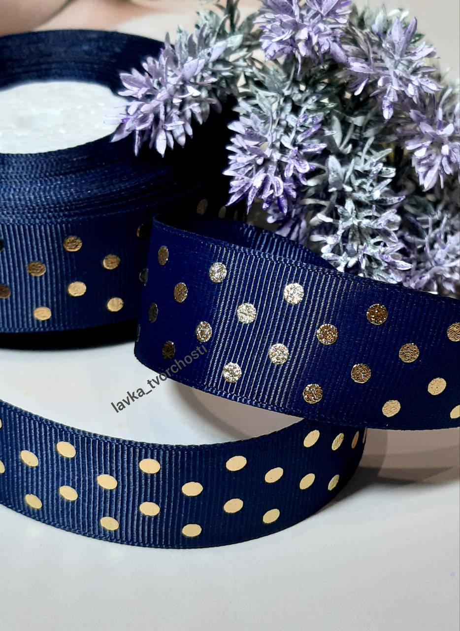 Стрічка репсова шириною 2,5см кольору сапфір Горох золотий