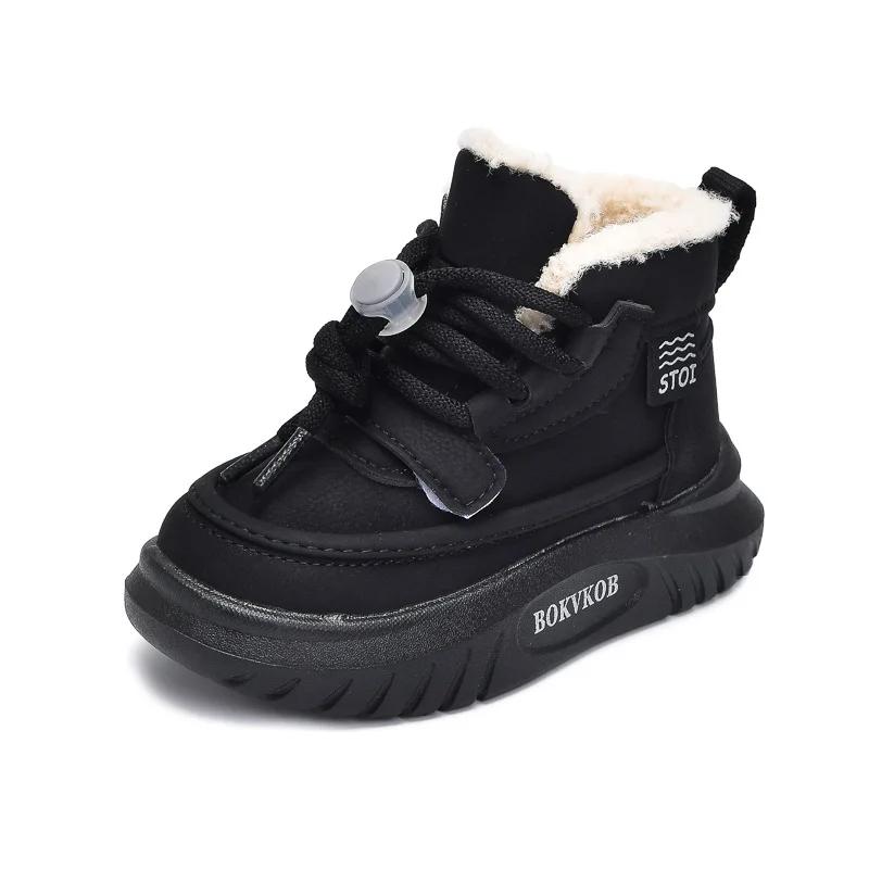 Студенческие короткие ботинки для зимы, модные теплые ботинки для мальчиков и девочек с тяговым тросом, 2024, новые модные детские ботильоны с мехом, нескользящие 21 чёрный