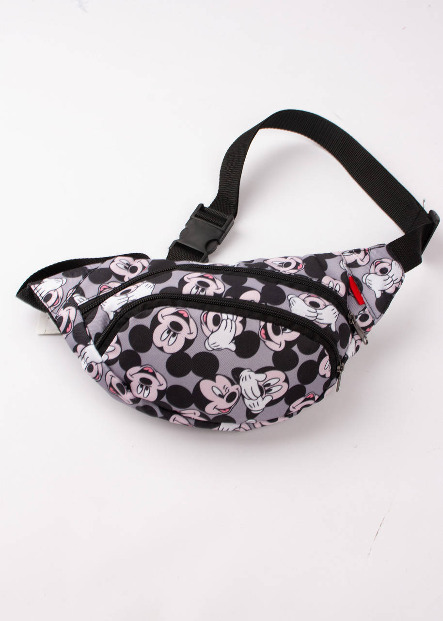 Поясная сумка-бананка c яркими принтами в виде Микки Мауса. Изготовлена из прочного, но мягкого полиэстера. Длина ремешка регулируется.